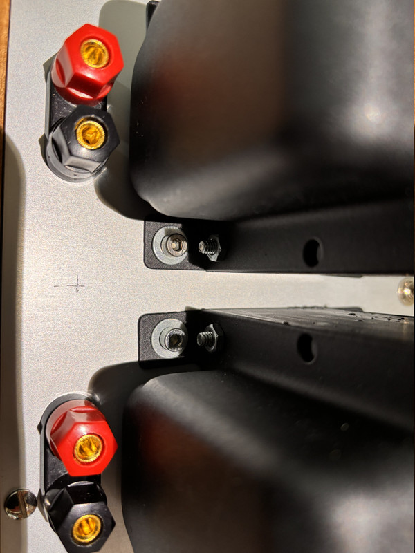 Här är bägge switcharna inkopplade. Triod- UL-swichen i mitten (röd) och återkopplingsswitchen sitter mellan högtalarterminalerna i förstärkarens bakkant (längst upp i bilden).