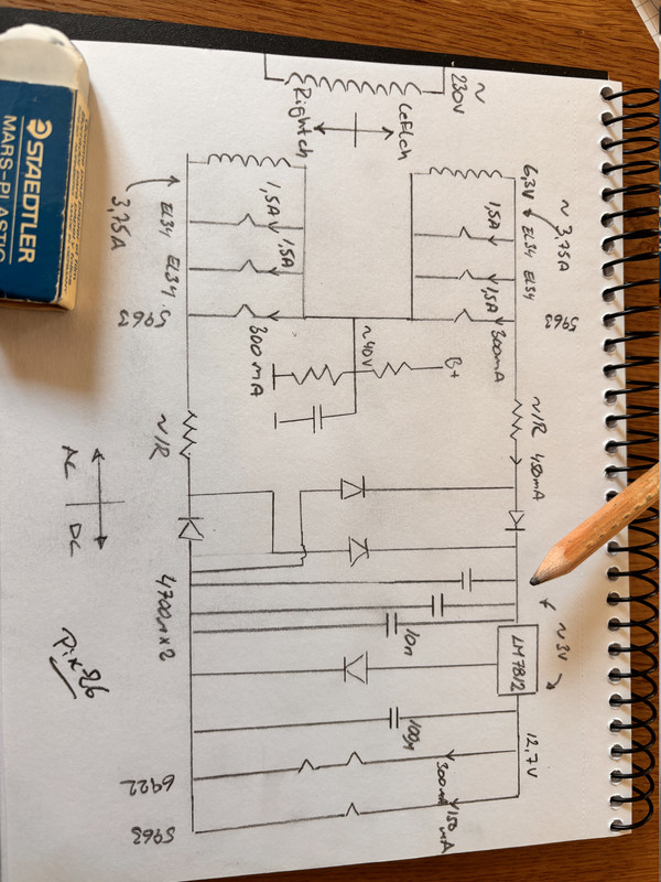 Den totala glödströmmen torde hamna runt 7,5A så att bygga om hela slutsteget till DC känns övermäktigt. Och med tanke på tillkommande förluster så riskerar glödnätdelen inte räcka till (50VA). Så planen just nu är att behålla AC till slutsteget (2x6,3Vac@3,3A) och samtidigt (från samma trafo) göra om till 12,6Vdc@450mA som matas till grammofonsteget. Denna DC kommer då att vara spänningsreglerad till 12,6Vdc mha en LM7812 och en diod.