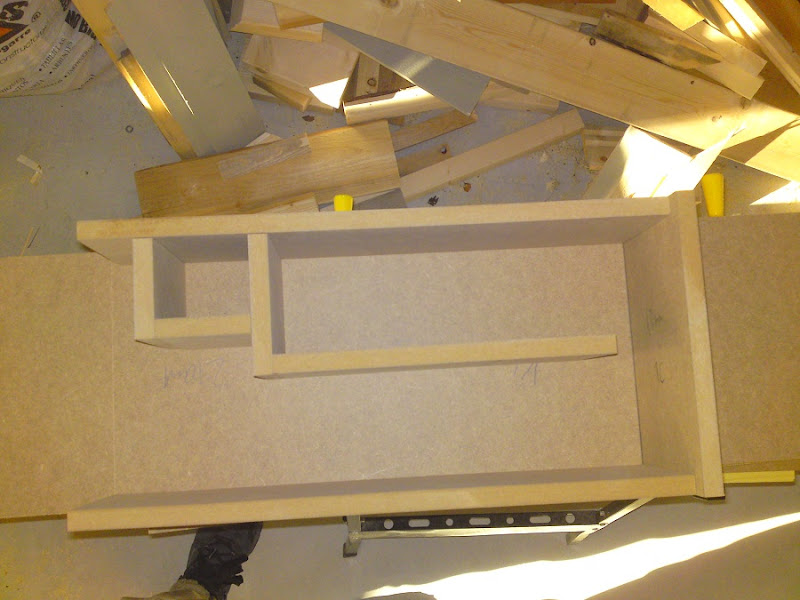 Släpade in arbetsbordet från förrådet idag, ställde upp det i köket och skred till verket med att borra och plugga den första lådan.
