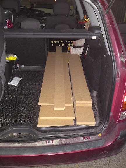 Kalle och jag la in den smala, 2440 mm långa spillbiten i bilen. Dem låg på intsrumenbrädan och det gick att precis stänga bakluckan. Så är livet det med liten bil.